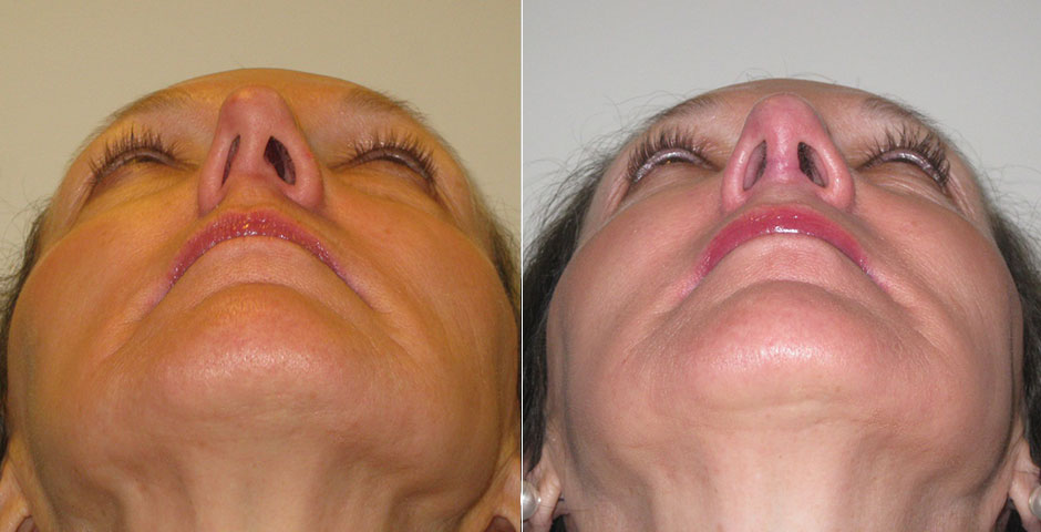 This patient had previous rhinoplasty with another surgeon but continued to experience severe nasal airway obstruction due to a deviated septum and both internal and external valve collapse. Her breathing was significantly improved after cosmetic rhinoplasty with septal reconstruction and valve reconstruction using cartilage grafts.